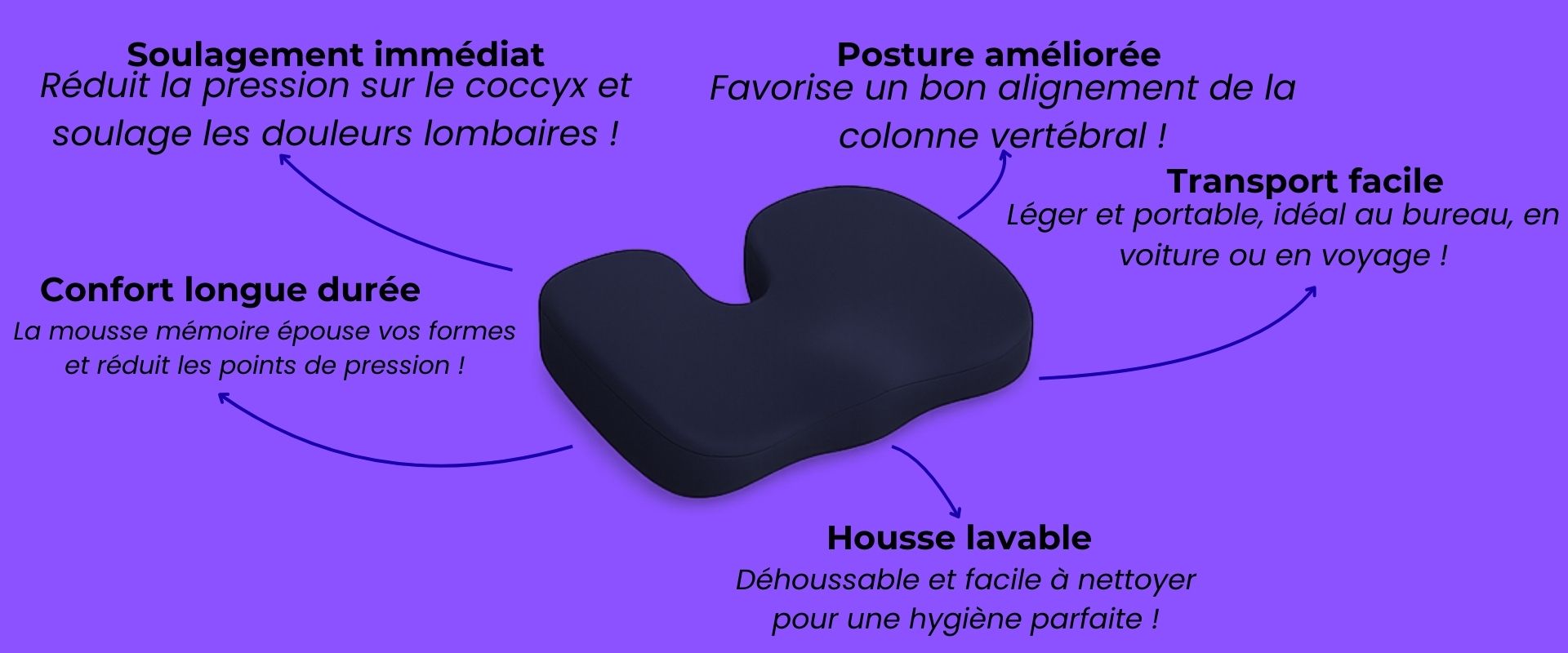 Le coussin soulage immédiatement la pression dès la première utilisation 🪑, avec souvent un confort instantané au niveau du dos et du coccyx .